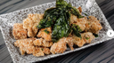 Crispy bite-sized chicken pieces seasoned with salt and pepper, garnished with fried basil leaves.