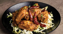 Crispy chicken wings glazed in a savory sauce, topped with sliced green onions and dried red chilies, served on a bed of shredded cabbage.