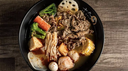 Sliced beef, pork, or chicken, cabbage, broccoli, quail eggs, and udon noodles.
