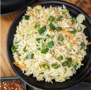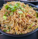 Stir-fried rice tossed in a wok with mixed vegetables, Schezwan sauce, soy sauce, and pepper.