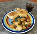 Eggs, halal turkey bacon, and cheese on a toasted tortilla. Served with house potatoes.