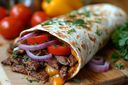 Steak, chicken, or sausage, rice, lettuce, tomato, peppers, red onions, and sauce, with a choice of rice, steak fries, or onion rings.
