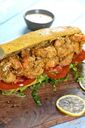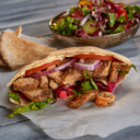 Chicken stuffed in pita bread, lettuce, tomato, red onions, and sauce, with a choice of rice, steak fries, or onion rings.