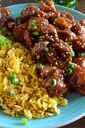 Bourbon chicken, with a choice of rice, steak fries, or onion rings.